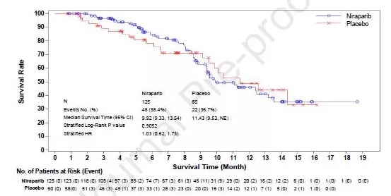 研究预计招募591例患者,由于SCLC一线标准治疗的变革,在入组185例患者后,研究于2020年3月份提前终止。实际272例患者接受筛查,185例患者入组,尼拉帕利组和安慰剂组分别入组125例和60例患者,两组中位随访时间7.7个月和6.6个月。2020年3月数据锁库时,两组分别有11例和7例患者继续接受治疗,基线特点均衡可比,尼拉帕利组和安慰剂组分别有72.8%和78.3%的患者出现疾病进展或死亡。