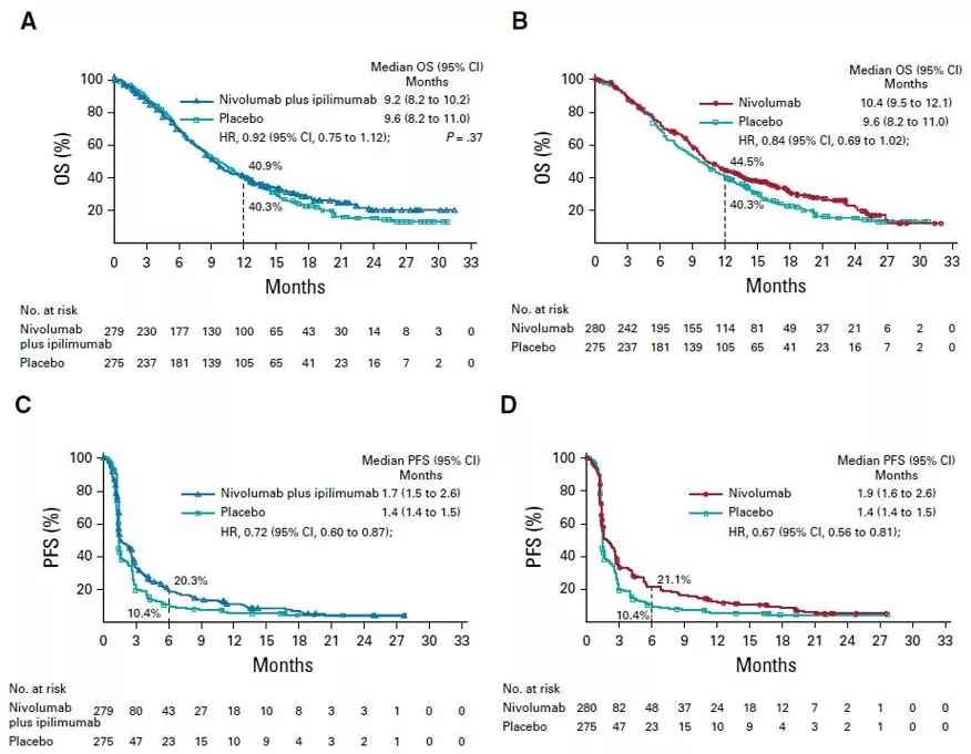 免疫治疗:2021年3月,JCO杂志公布了CheckMate-451研究的结果2,该研究探索了Nivolumab联合Ipilimumab或Nivolumab单药维持治疗广泛期SCLC的疗效及安全性。研究纳入接受3~4周期一线含铂双药化疗出现CR或PR或接受4周期化疗后,疗效评估为SD的患者,按照1:1:1的比例随机分为双免疫治疗(Nivolumab 1mg/kg联合Ipilimumab 3mg/kg,每3周治疗一次,12周后改为Nivolumab 240mg,每两周一次维持),或Nivolumab单药(240mg,每两周一次),或安慰剂治疗。结果发现,双免疫、单免疫和安慰剂组的中位OS分别为9.2个月、10.4个月和9.6个月,中位PFS分别为1.7个月、1.9个月和1.4个月,ORR分别为9.1%、11.5%和4.2%,中位响应持续时间分别为10.2个月、11.2个月和8.1个月,研究未能达到主要研究终点(图4)。