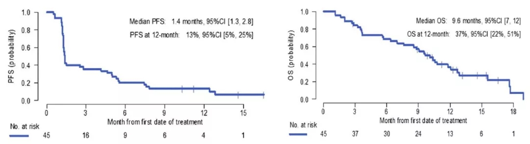 除了O药及O药联合伊匹木单抗以外,K药在SCLC患者中的维持治疗同样有所探索3。2018年5月,JTO杂志公布了K药单药用于维持治疗广泛期SCLC患者的疗效及安全性。纳入45例患者后发现,患者的中位PFS和中位OS分别仅为1.4个月和9.6个月。与历史对照相比,患者预后无明显提高(图5)。