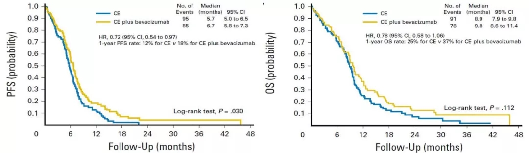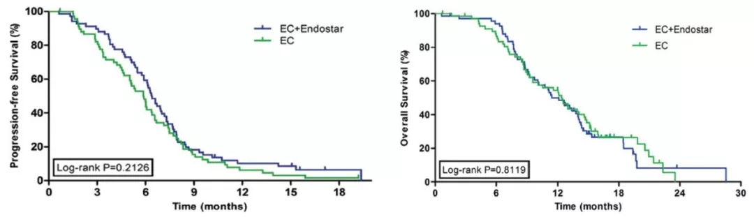而国产抗血管生成药物恩度同样未能逃避失败的命运,甚至ORR、PFS和OS的三个研究终点均为阴性。这项研究与GOIRC-AIFA FARM6PMFJM研究设计基本相似,联合强化治疗后允许患者接受恩度的维持治疗。两组的ORR分别为75.4%和66.7%,中位PFS分别为6.4个月和5.9个月,两组的中位OS分别为12.1个月和12.4个月,均无统计学差异6(图8)。