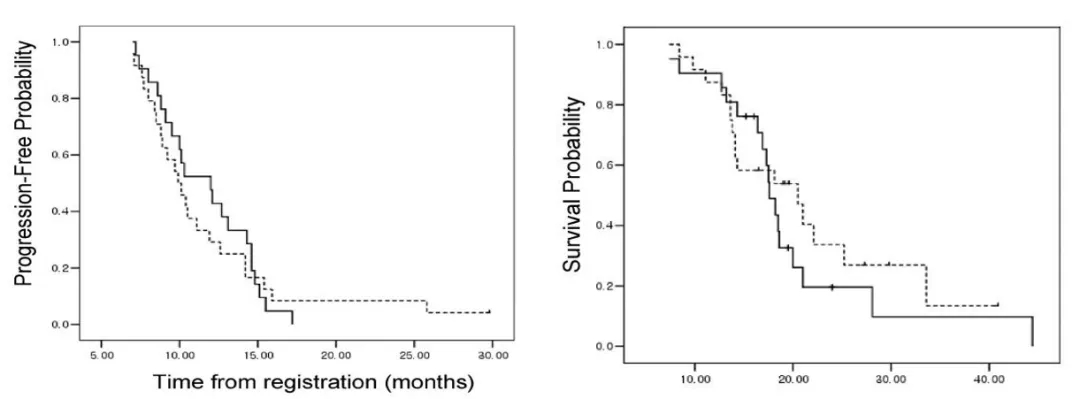 疗效:两组中位独立评审委员会评估的中位PFS分别为1.54个月和1.36个月,HR=0.66,P=0.0242;研究者评估的中位PFS分别为1.48个月和1.41个月,HR=0.88(图1)。两组中位分OS分别为9.92个月和11.43个月,HR=1.03(图2)。