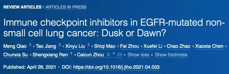 近日,同济大学附属肺科医院周彩存教授团队在最新一期Journal of Thoracic Oncology(JCR/中科院一区,2019年最新影响因子13.357)上发表了长篇综述文章“Immune checkpoint inhibitors in EGFR-mutated non-small cell lung cancer: Dusk or Dawn”,系统总结了免疫检查点抑制剂在EGFR突变型晚期非小细胞肺癌的应用进展和困境。主要内容如下: