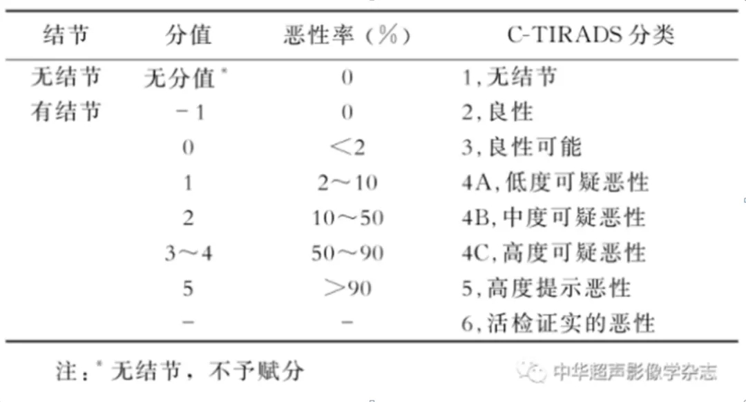 2. 形态学:B超检查方面,甲状腺结节在B超上的恶性特征是低回声、边界不清、微钙化、竖直类的生长(纵横比>1)。全球各地根据B超的恶性征象,都形成了区域性的评估体系。ATA基于超声特征的模式识别,将甲状腺结节分为:极低风险、低风险、中风险、高风险和良性。美国放射学学学会基于加权点,形成了ACR-TIRADS分类,为全球多个地方认可。《2020年甲状腺结节超恶性风险分层中国指南》推荐了基于计数法的C-TIRADS评分(图1)。细胞形态学方面,主要采用Bethesda分级。例如,甲状腺乳头状癌细胞学诊断最低标准为:含胞体结构;核增大,外形不规则;核内假包涵体;核沟;多个小核仁或大核仁。
