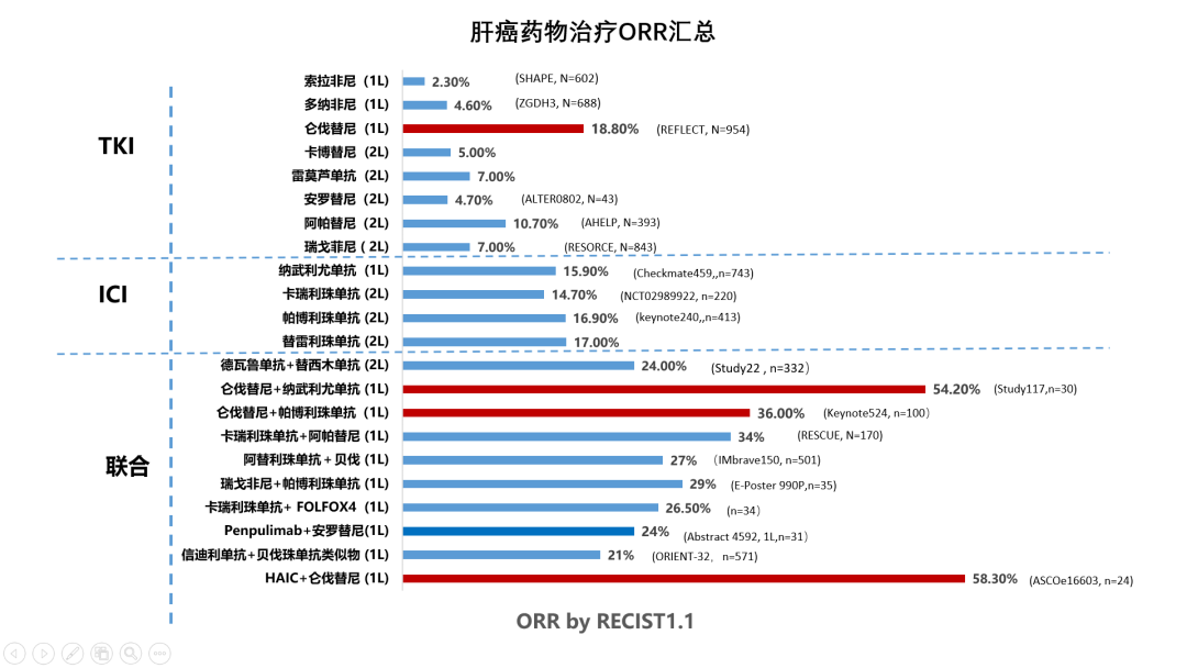 张倜教授:正如王鲁教授所言,2018年仑伐替尼上市给很多肝癌患者带来了新的希望,REFLECT研究显示其单药一线使用客观缓解率达到18.8%(RECIST 1.1),非常鼓舞人心,远超当时SHAPE研究中索拉菲尼一线2.3%(RECIST 1.1)的客观缓解率。无论是单药抑或联合PD-1抗体均逐渐成为主流推荐,尤其以“可乐组合”(仑伐替尼联合帕博利珠单抗,俗称”可乐组合“)与 “类可乐组合”(仑伐替尼联合国产PD-1/PD-L1)著称。