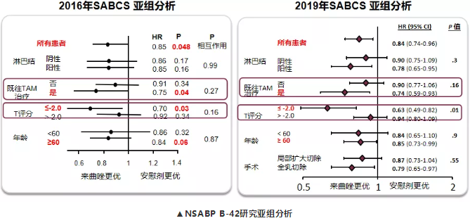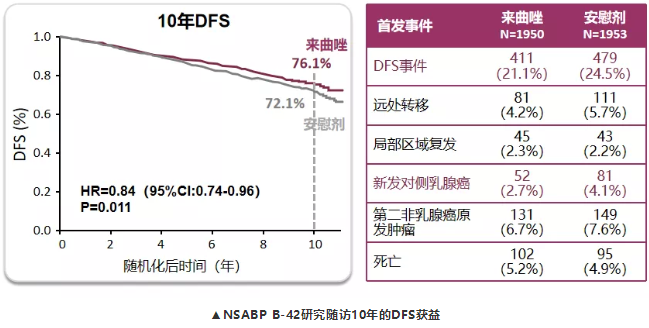 2019年SABCS大会进一步报道了NSABP B-42随访10年的数据。结果看到NSABP B-42研究整体上延续了获益趋势。在主要终点DFS方面,随访10年的绝对获益扩大到4%(76.1% vs 72.1%,HR=0.84;P=0.011),P值达到了统计学差异。