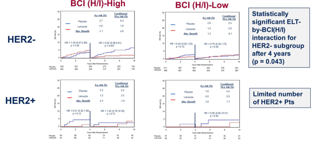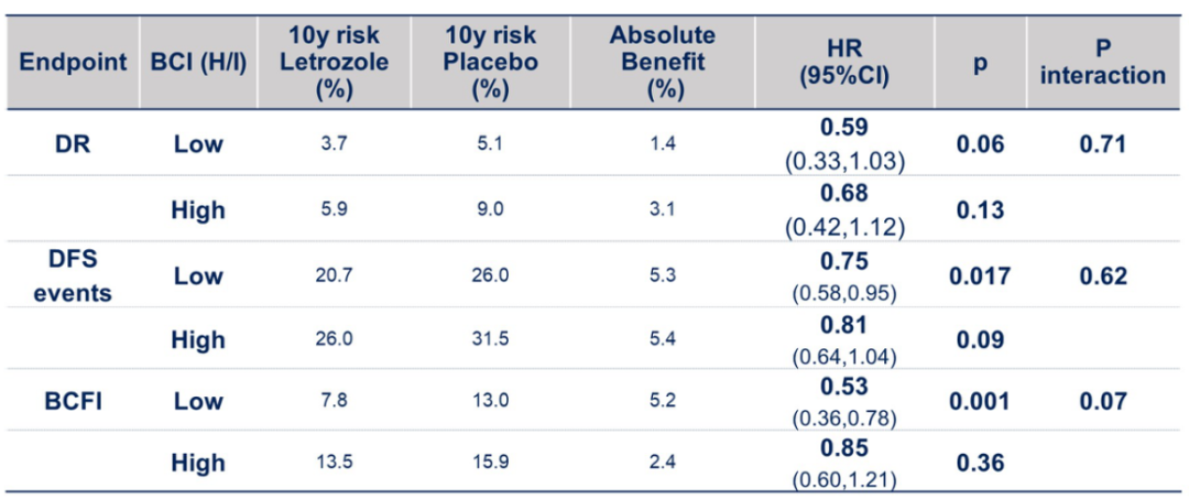 该研究提示:延长AI治疗,DRFI的10年绝对获益为1.6%;淋巴结阳性和TAM续贯来曲唑内分泌治疗的BCI-H/I-High患者延长4年以上AI治疗可显著降低远处复发率。