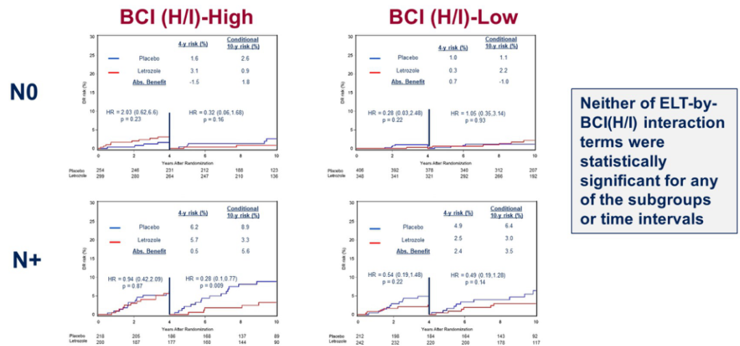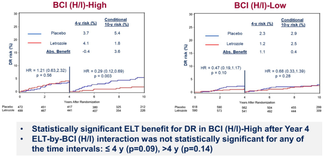 而根据NSABP B-42研究中心发现的LET对DR的非比例效应,该研究以4年为界进行了DR的二次分析。在LET的初始4 年内,任何BCI-H/I组的DR获益均无统计学意义。但是LET超过4年,BCI-H/I-High组患者DR获益(HR=0.29,95%CI:0.12~0.69,P=0.003),BCI-H/I-Low组的患者无获益(HR=0.68,95%CI:0.33~1.39,P=0.28);亚组分析中,BCI-H/I-High在淋巴结阳性(P=0.009)和TAM续贯来曲唑治疗(P=0.009)组中显示DR的获益。