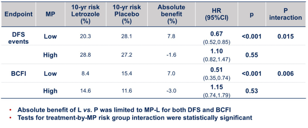 研究结论:70基因检测可以识别NSABP B-42研究中能从LET中获益患者,0.000<MP 评分≤0.355组在LET后,其DR、DFS和BCFI获益均有统计学意义。
