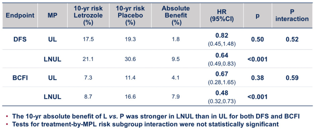研究结果显示,MP-L组患者延长来曲唑治疗,无论其主要终点DR(HR=0.43,95%CI:0.25~0.74,P=0.002),还是其次要终点DFS和BCFI均可获益(P= 0.015,P=0.006);而MP-H组患者LET获益无统计学差异(HR=0.65,95%CI:0.34~1.24,P=0.19)。在MP-L亚组分析中,MP-LNUL组延长来曲唑治疗可以在DR、DFS 和BCFI上获益、且有统计学差异,但 MP-UL 组延长来曲唑治疗与安慰剂组获益无统计学差异。