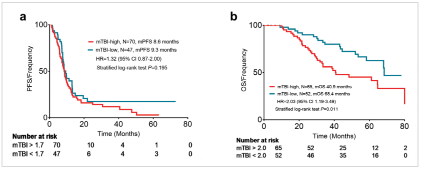 研究通过Bootstrap重采样法确定预测PFS和OS的最佳mTBI阈值分别为1.7和2.0。结果显示,与治疗前低mTBI(<2.0)患者相比,高mTBI(>2.0)患者的中位OS显著更短(下图b,40.9 vs 68.4个月,HR 2.03,95%CI:1.19~3.49,P=0.011)。但低mTBI(<1.7)和高mTBI(>1.7)患者的中位PFS无显著差异(下图a)。