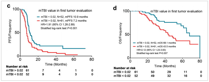 研究进一步分析了治疗早期(第一次肿瘤评估时)mTBI下降幅度与患者生存的关系。结果显示,mTBI 降低到0.02%以下的患者,中位PFS(下图c,10.9 vs 7.2个月,HR 1.91,95%CI:1.26~2.89,P<0.001)和中位OS均显著更长(下图d,68.1 vs 43.5个月,HR 2.21,95%CI:1.23~3.63,P=0.007)。