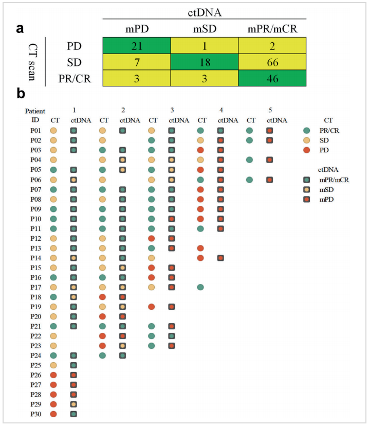 该研究分析了mTBI的受试者工作特征曲线(ROC)值为0.98(P=0.002),提示mTBI可以作为肿瘤疗效评估的有效工具。通过与CT检查(RECIST 1.1)对比发现,二者具有很好的一致性,mTBI与影像学评价的CR/PR一致性为88.5%(46/52,下图a),PD一致性为87.5%(21/24,下图a);而且有16.7%(5/30)的患者可以通过液体活检相较于CT检查更早发现PD(下图b)。