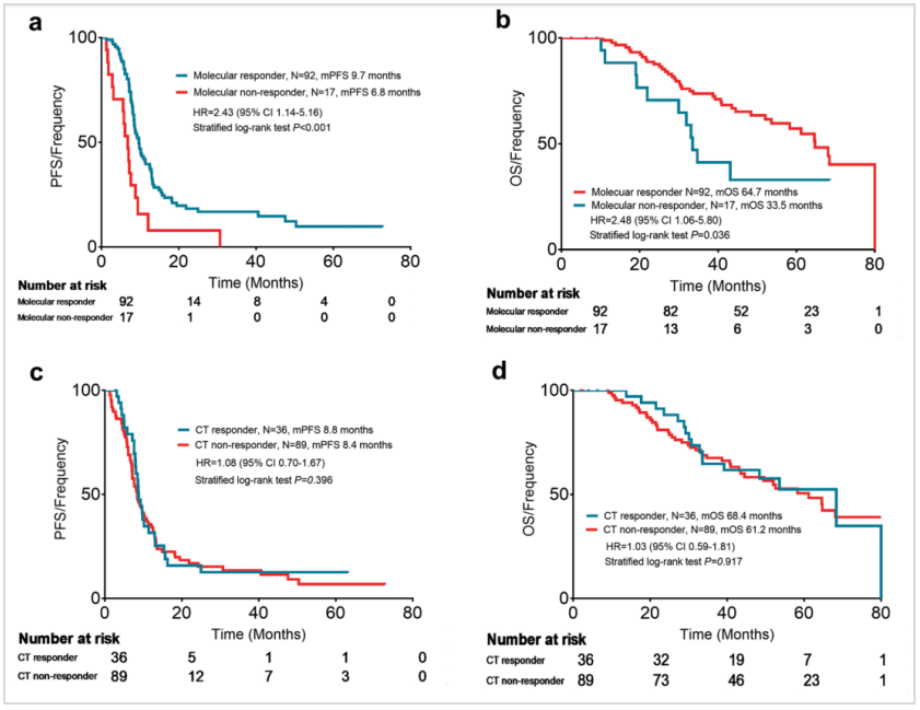 研究进一步分析了2个周期治疗后mTBI或CT疗效评价的生存结局。结果显示,mTBI评价达到分子学缓解的患者与未缓解的患者相比,中位PFS(下图a,9.7 vs 6.8个月,HR 2.43,95%CI:1.14~5.16,P<0.001)和中位OS均显著更长(下图b,64.7 vs 33.5个月,HR 2.48,95%CI:1.06~5.80,P=0.036);而CT评价达到缓解与未达到缓解患者的PFS和OS均无显著差异(下图c和d)。