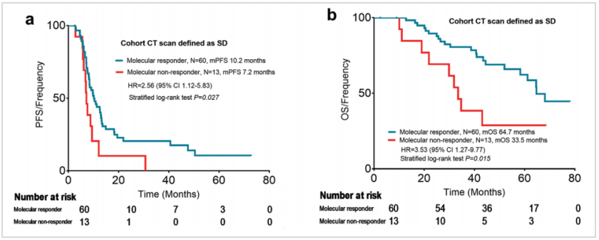 在73例由CT评价为SD的患者中,mTBI可以进一步识别出患者的预后差异,即mTBI评价为分子学缓解与未缓解的患者相比,中位PFS(10.2 vs 7.2个月,HR 2.56,95%CI:1.12~5.83,P=0.027)和中位OS显著更长(64.7 vs 33.5个月,HR 3.53,95%CI:1.27~9.77,P=0.015)。