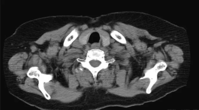 CT及超声检查均未见异常(图3)。经与本院内分泌外科会诊,2个月行超声引导下细针穿刺活检2次;但在甲状腺中未检测到癌成分。一般来说,隐匿性甲状腺癌的颈部淋巴结转移病例需要全甲状腺切除术。然而,考虑到本例患者PTC进展缓慢、患者年龄、既往有慢性心功能不全、高血压、糖尿病、哮喘病史及整体身体状况,内分泌外科医生未能获得患者的知情同意;因此,对该患者选择密切观察随访。手术后8年,未见颈部肿瘤复发或甲状腺癌大小变化,患者进展良好。