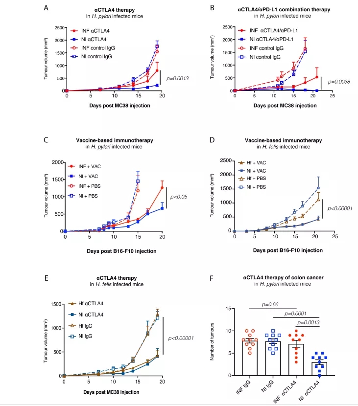 研究发现,在接受抗细胞毒性T淋巴细胞相关蛋白4 (CTLA-4)和/或程序性死亡配体1 (PD-1) 或疫苗治疗的小鼠中,未感染幽门螺杆菌小鼠的肿瘤体积明显小于感染小鼠。此外,无论肠道微生物的整体组成如何,受感染小鼠接受癌症免疫治疗,肿瘤中激活的肿瘤特异性CD8+ T细胞较少。此外,体外共培养试验表明,幽门螺杆菌感染小鼠中的树突状细胞造成肿瘤特异性CD8+ T细胞增殖较低。
