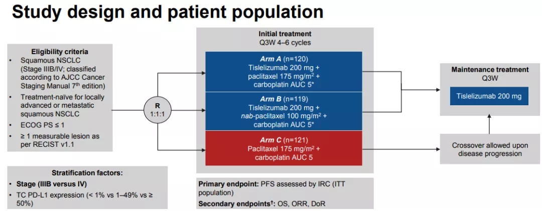 多中心、随机、开放标签RATIONALE 307研究在中国招募了未经治疗、不适合手术或放化疗的局部晚期或转移性(IIIIB或IV期)鳞状NSCLC成人患者,ECOG PS 0或1,至少1个可测量的病变。分层因素是疾病分期(IIIIB与IV)和PD-L1表达。主要终点是PFS。患者按1:1:1随机分配至替雷利珠单抗+紫杉醇(A组)、替雷利珠单抗+白蛋白结合型紫杉醇和卡铂组(B组)或紫杉醇+卡铂(C组)。