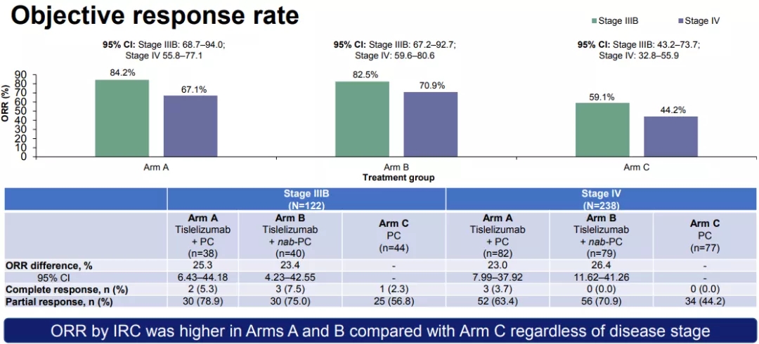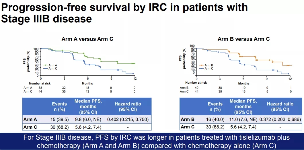该亚组分析中,替雷利珠单抗联合紫杉醇、替雷利珠单抗联合白蛋白结合型紫杉醇和卡铂与标准治疗相比,在IIIB期或IV期晚期鳞状非小细胞肺癌患者中观察到具有临床意义PFS和ORR改善,且总体耐受性良好。IIIB期和IV期亚组的安全性特征没有差异,与整体人群一致。