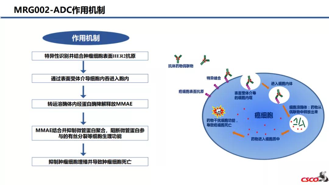MRG002作为我国自主研发的新兴ADC药物,由糖修饰曲妥珠单抗通过可酶切vc连接子与MMAE(甲基澳瑞他汀E)偶联而成,从机制而言对HER2低表达人群具有先天优势,江泽飞教授表示“其可以精准制导,可以通过抗体与细胞毒药物结合起到定向化疗的作用”。