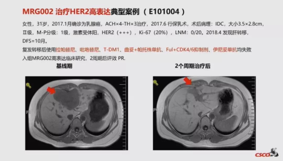 该研究中一例31岁HR阳性、HER2阳性晚期乳腺癌肝转移患者,在使用拉帕替尼、吡咯替尼、T-DM1、曲妥珠单抗+帕妥珠单抗、氟维司群+CDK4/6抑制剂、伊尼妥单抗均治疗失败后,入组本研究,经MRG002治疗2周期后病灶明显退缩,疗效PR。