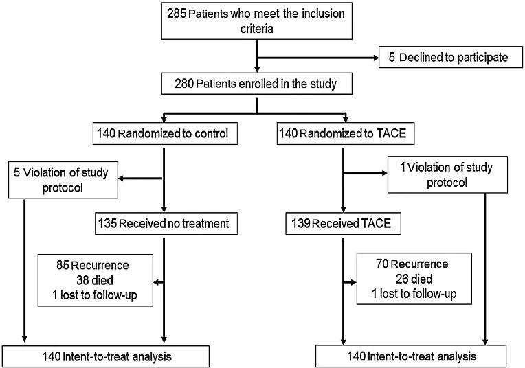 在秦叔逵教授的指导下,我参与《CSCO原发性肝癌诊疗指南(2020版)》术后辅助治疗部分的修订。在指南中我们客观评估了近年来关于多种术后辅助治疗的有益探索,指出TACE是目前术后辅助治疗的主要手段,对于术后复发的高危人群可以降低肿瘤复发率。该推荐是基于复旦大学附属中山医院周俭教授2018年发表在Clinical Cancer Research杂志的一项RCT研究(Clin Cancer Res. 2018 May 1;24(9):2074-2081.),该研究评估了辅助性经动脉化疗栓塞术(TACE)对中危(单个肿瘤大于5cm,无微血管侵犯)或高危(单个肿瘤有微血管侵犯,或两个或三个肿瘤)HBV相关肝癌患者的安全性和有效性。在这项随机对照、III期临床试验中(图1),280名符合条件的患者被分配到辅助性TACE(n=140)或无辅助治疗(对照组;n=140)组。主要终点为无复发生存率(RFS);次要终点包括总生存率(OS)和安全性。