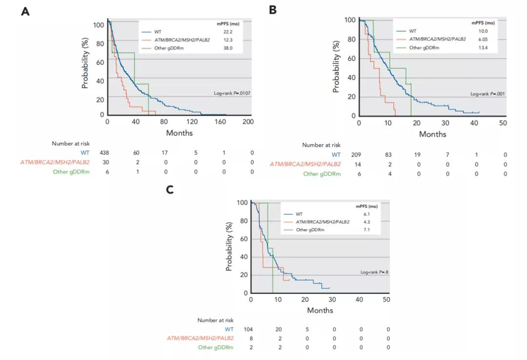 BRCA2/MSH2/PALB2/ATM突变及其他gDDRm患者ADT(A)、阿比特龙(B)、多西他赛(C)治疗的PFS K-M曲线