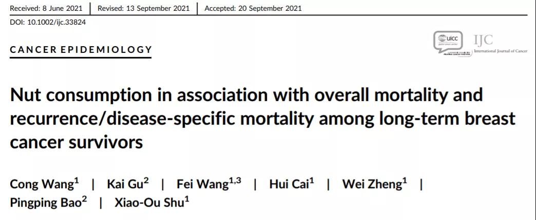 [1]Wang C, Gu K, Wang F, et al. Nut consumption in association with overall mortality and recurrence/disease-specific mortality among long-term breast cancer survivors [published online ahead of print, 2021 Oct 19]. Int J Cancer. 2021;10.1002/ijc.33824. doi:10.1002/ijc.33824