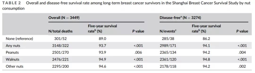 中位随访8.27年共发生374例死亡,其中252例死于乳腺癌。在饮食评估后5年(被诊断为乳腺癌后10年),与非坚果消费者相比,坚果消费者的10年OS率(93.7% vs 89.0%)和DFS率更高(94.1% vs 86.2%),而且无论是食用花生、核桃还是其他坚果都观察到类似的生存优势。