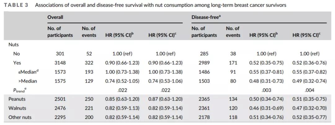 这项基于人群的队列研究,纳入了3449例雌激素受体(ER)或孕激素受体(PR)阳性的乳腺癌幸存者,其中有3148人是坚果消费者。与非坚果消费者相比,坚果消费者的乳腺癌诊断年龄更小、BMI更低、总能量摄入更高、豆制品摄入量更高。