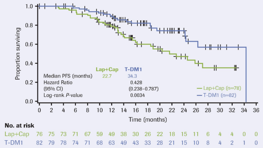 其次,T-DM1和吡咯替尼的PFS基本持平。但EMILIA和PHENIX研究的入组人群有所差异,虽然都是抗HER2进展后的治疗,但EMILIA研究中大部分患者是经过抗HER2一线治疗进展的;而PHENIX研究试验组中有不少患者(36.8%)未接受过任何晚期治疗或大部分为继发耐药。两个结果还不能完全等同,但T-DM1是唯一有OS阳性结果的二线方案。2021年ESMO更新的EMILIA研究亚洲人群数据显示OS获益明显(34.3 vs 22.7个月,HR 0.428,95%CI:0.238~0.787,P=0.0034)。