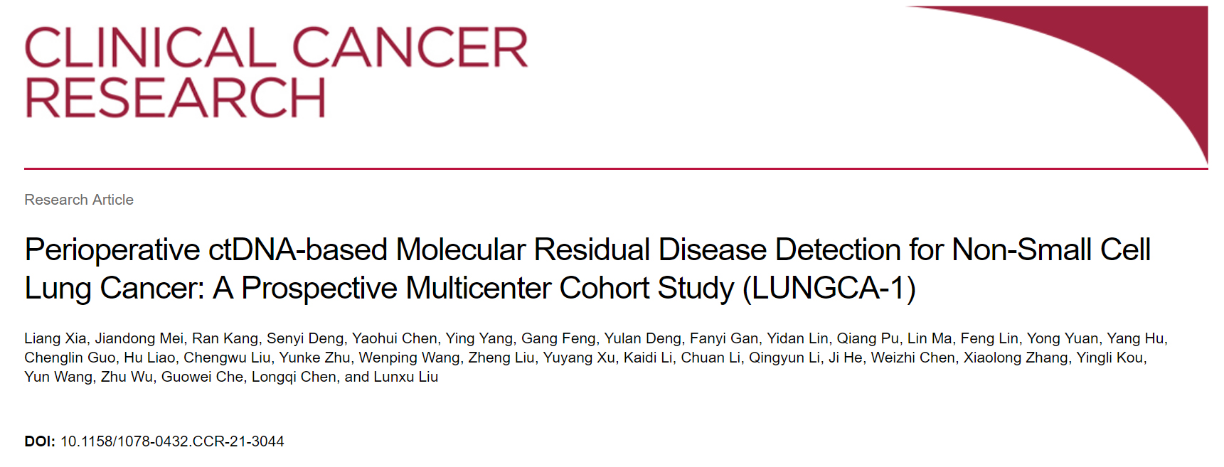 2021年11月,Clinical Cancer Research杂志(中科院1区TOP期刊,IF= 12.531)发表了由四川大学华西医院刘伦旭教授团队联合四川省人民医院、成都上锦南府医院,及无锡臻和生物科技有限公司(以下简称“臻和科技”)合作的研究成果“Perioperative ctDNA-based Molecular Residual Disease Detection for Non-Small Cell Lung Cancer: A Prospective Multicenter Cohort Study (LUNGCA-1)”。