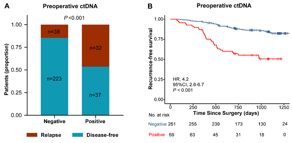 (A)比较术前ctDNA阴性患者和术前ctDNA阳性患者的总复发率。