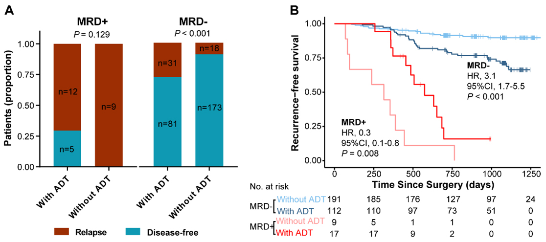 (B)Kaplan-Meier分析比较MRD阳性患者接受辅助治疗(深红线)和未接受辅助治疗(浅红线)的RFS,以及比较MRD阴性患者接受辅助治疗(深蓝线)和未接受辅助治疗(浅蓝线)的RFS。