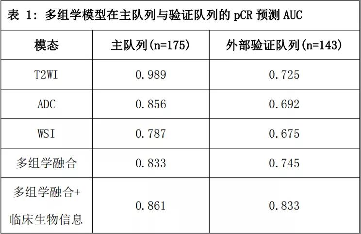 我们的研究表明,与单组学特征相比,利用多组学特征的构建的pCR预测模型性能更好。多组学特征可以从宏观和微观两个尺度反映肿瘤特性,提高模型的泛化性并在外部验证队列中显示出更良好的预测性能。此外,结合临床特征可以进一步提高模型预测pCR的性能。