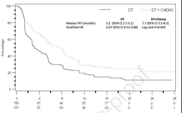 数据分析时,两组分别有72%和85%的患者出现疾病进展或死亡。中位PFS分别为7.7个月和3.2个月,HR=0.67,两组ORR分别为42.4%和29.3%。基于PD-L1及TMB水平并未发现客观响应率存在区别。