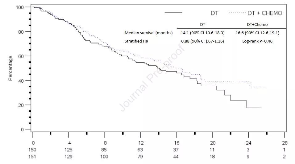 中位OS分别为16.6个月和14.1个月,HR=0.88,P=0.46,1年OS率分别为59%和55%,亚组分析未发现获益人群。