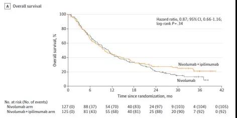 虽然这一模式在一线治疗获得阳性结果,但是在后线治疗领域,却以失败告终。今年,JAMA Oncology杂志发表了Lung-MAP S1400I这一III期临床研究的结果。符合入组标准的患者按照1:1的比例随机分为纳武单抗联合伊匹木单抗或纳武单抗单药治疗,研究同样被提前终止。联合治疗组和单药治疗组分别入组125例和127例患者,联合治疗组和单药治疗组的中位OS分别为10.0个月和11.0个月,HR=0.87,P=0.34。1年OS率分别为45%和44%,两年OS率分别为28%和22%,两组中位PFS分别为3.8个月和2.9个月,HR=0.80,P=0.09,1年PFS率分别为17%和10%,2年PFS率分别为12%和5%,两组ORR分别为18%和17%,一线的成功并未带来二线的获益。