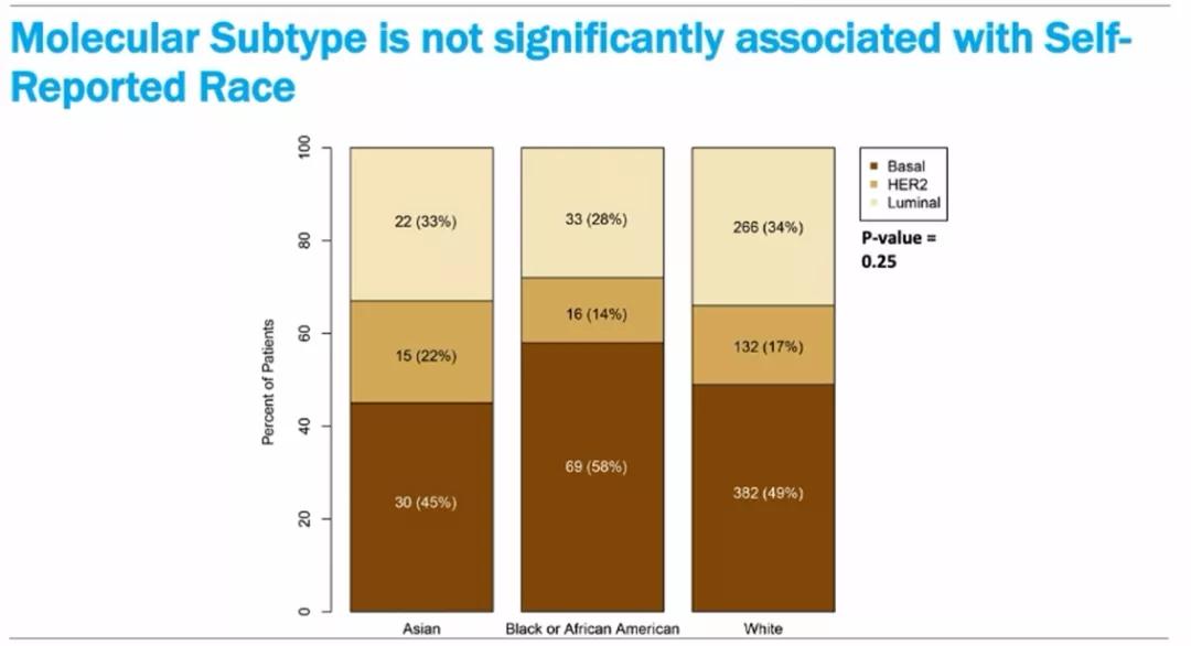 ◆ 结果:在分析的975例患者中,787例(81%)为白人,68例(7%)为亚洲人,120例(12%)为黑人或非裔美国人。不同种族患者的治疗前分子亚型(基底型、HER2、Luminal型)没有显著差异(P=0.25)。不同种族的pCR率和RCB分级均没有显著差异(pCR:P=0.89;RCB:P=0.88)。