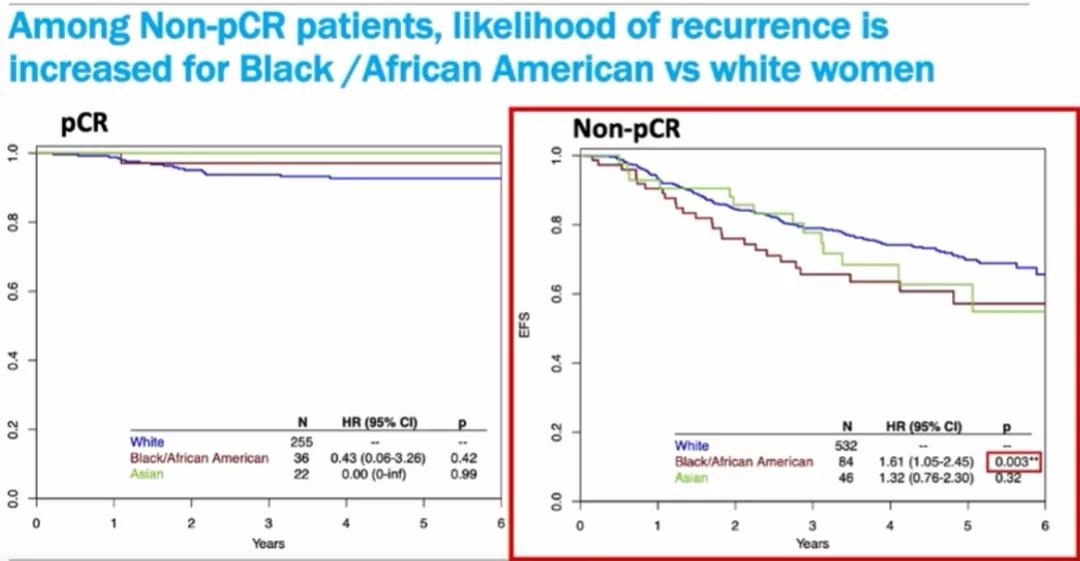相较于白人患者,黑人/非裔美国患者(HR 1.38,P=0.12)和亚洲患者(HR 1.11,P=0.71)的无事件生存(EFS)无显著差异。在达到pCR的患者中,不同种族间的EFS无显著差异(P值分别为0.42和0.99);但在Non-pCR患者中,相较于白人患者,黑人/非裔美国人患者的复发风险显著更高(EFS HR 1.61,P=0.003),而亚洲患者无显著差异(HR 1.32,P=0.32)。