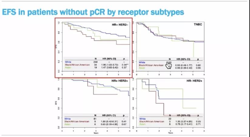在不同分子亚型的Non-pCR患者中,只有HR+/HER2-患者存在EFS种族差异,黑人/非裔美国人的复发风险比白人患者更高(EFS HR 1.9,P=0.04),而TNBC、HR+/HER2+、HR-/HER2+患者不存在EFS种族差异。