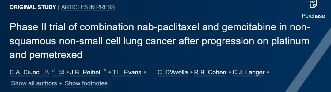 对于驱动基因突变阴性的晚期NSCLC患者而言,一旦含铂双药治疗进展,患者后续的治疗选择非常有限。在胰腺癌等其他癌种中,白蛋白紫杉醇联合吉西他滨治疗展示了一定的协同作用。但是近期发表于Clinical Lung Cancer的一项研究发现,这一联合治疗策略并不能给肺癌患者带来获益。