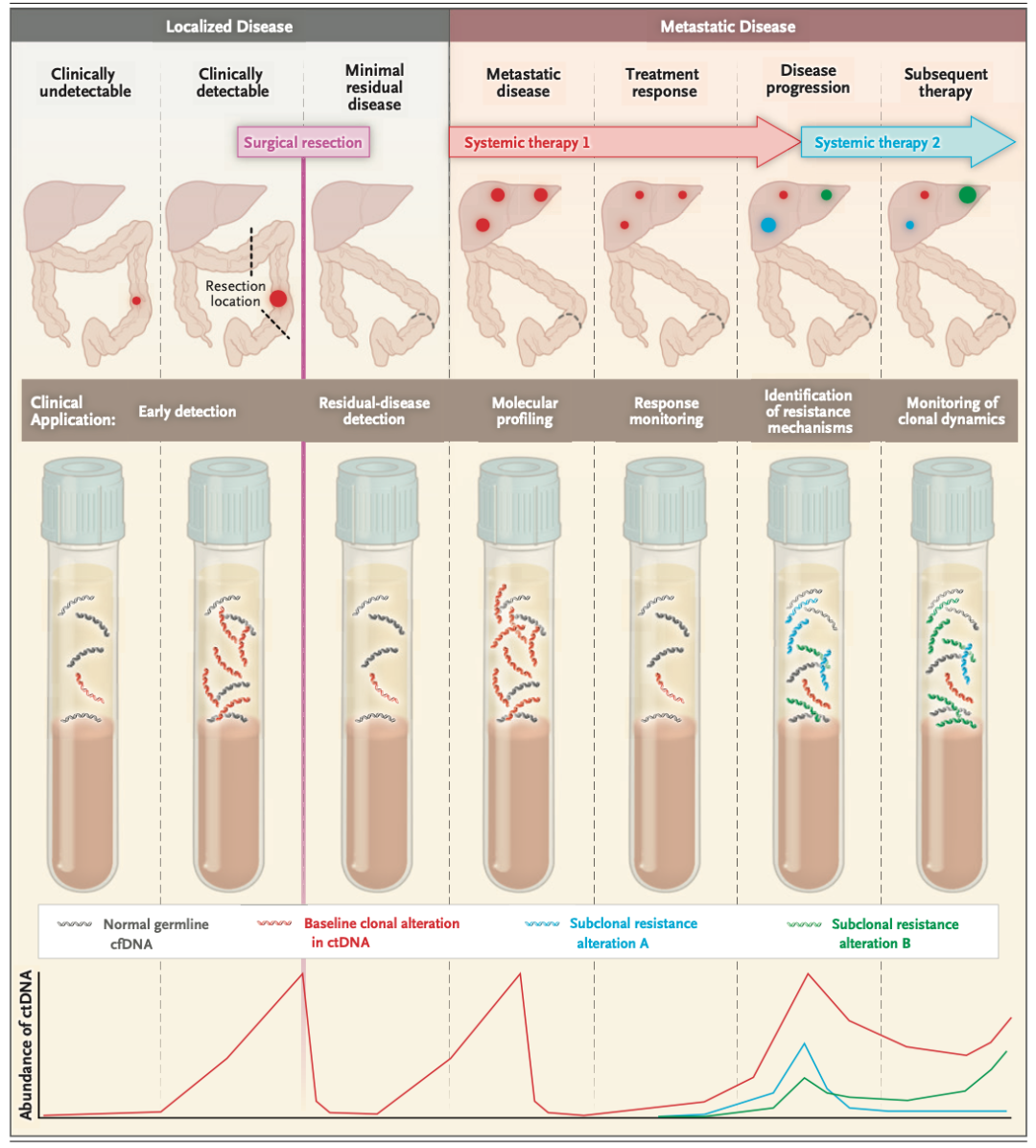 图2.液体活检在肿瘤各个诊治阶段的用途(以结肠癌为例)