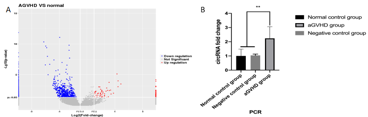 图1. A)火山图显示了在aGVHD患者和健康人中存在差异表达的circRNA;B)PCR检测证实了hsa_circ_0001599在肠道aGVHD患者的PBMCs中存在高水平表达。