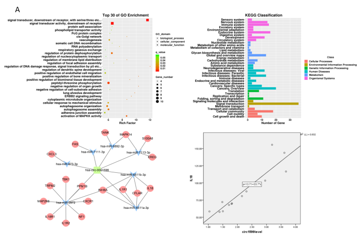 图2. A)具有显著差异表达的circRNA的GO和KEGG分析结果;B)ceRNA相互作用网络图;C)hsa_circ_0001599、IL18与aGVHD患者临床数据之间关系数据分析图。