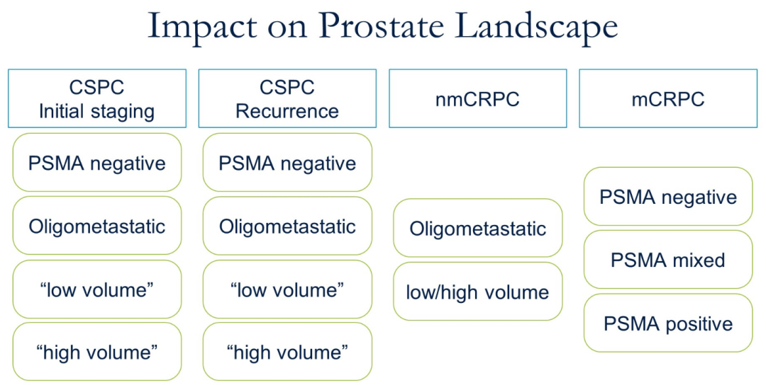 So heterogeneity on PSMA PET. How does that impact prostate cancer? So I would think of them in two different ways. So if you think about patients’ earlier stage—so patients with biochemical recurrence or at an initial stage—and there’s actually very low levels of heterogeneity within a patient. So patients are typically very homogeneous within the individual patient, but there can be heterogeneity across patients. So maybe 5 percent of patients will be negative on a PSMA PET and that will have, obviously, a limited sensitivity forcing metastatic disease. Now, overall, when you look at the literature in patients who have negative PSMA PETs, those patients do very well so it’s a positive prognostic factor (oddly enough), even though you’re not seeing where the disease is, potentially. Now, in the castration resistance setting, when you’re after chemotherapy, after abiraterone or enzalutamide and you’re heterogeneous—that’s a very poor prognostic factor, right? And so PSMA radioligand therapy in that setting is not going to be very good at targeting the entire extent of disease. And so patients who have mismatched FDG and PSMA uptake have incredibly poor outcomes. So it’s very different depending on the setting of disease where you’re at.