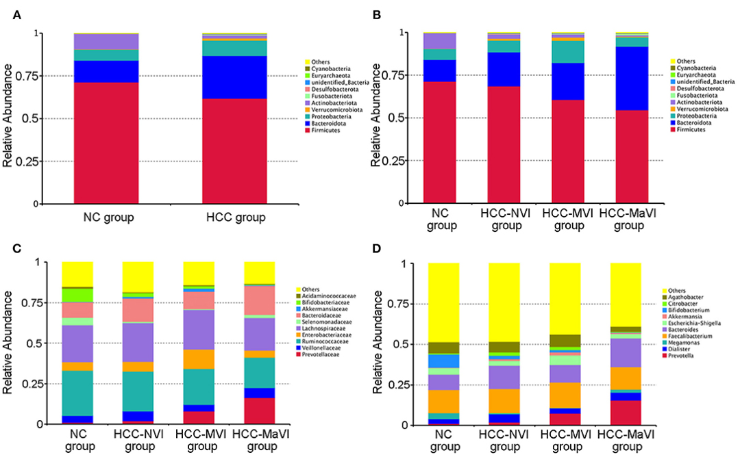 HCC-MVI组和无血管浸润组(HCC-NVI)的微生物群组成和结构有明显的差异。与HCC-NVI组和健康对照组相比,HCC-MVI患者的肠道细菌克雷伯菌、变形菌、普雷沃菌科和肠杆菌科显著富集,而厚壁菌、瘤胃球菌和单球菌科显著减少。其中,克雷伯菌被认为是HCC患者发生MVI的主要微生物类群及其关键特征。