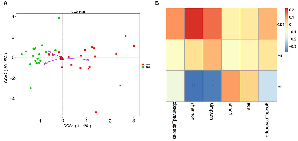 本研究了收集天津市肿瘤医院59名HCC患者(其中包括24名HCC-MVI的患者、20名HCC-NVI患者、15名HCC-MaVI患者)和16名健康对照者的粪便样本,并通过16S rRNA扩增子测序后进行全面的生物信息学分析。通过受试者工作特征(ROC)曲线评估微生物组特征在预测HCC患者是否合并MVI上的效用。运用免疫组化和免疫荧光法进一步分析HCC-MVI组肠道菌群与肿瘤微环境(Tumor microenvironment,TME)之间的相关性。