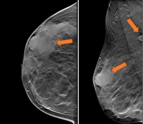 2021.7.7乳腺MRI:右乳外上象限肿物(BI-RADS-6)3.1cm×1.9cm×3.0cm,右腋窝见肿大淋巴结,M灶可能。