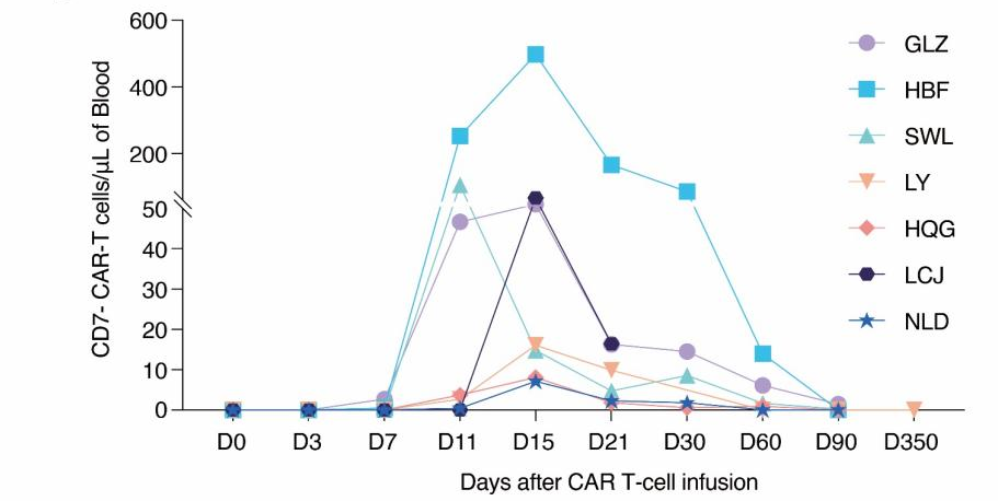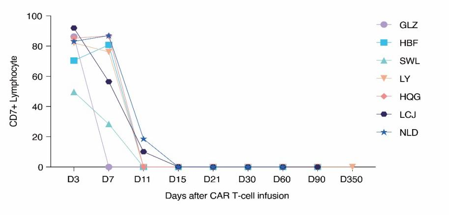 石慧医生说:我们实验室使用了特殊技术来减少CD7在CAR T淋巴细胞表面的表达,减少了CD7-CAR T细胞介导的自相残杀。我们的研究中所有患者的体内均检测到CD7 CAR-T细胞的扩增(见下图)。