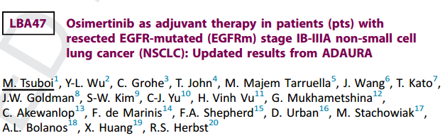 LBA47 - 奥希替尼作为IB-IIIA期EGFR突变型非小细胞肺癌(NSCLC)患者的辅助治疗:ADAURA的最新结果